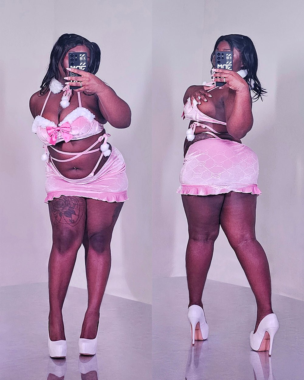Embrace the season with the Pastel Winter Top & Skirt. Crafted from soft, stretchy velvet with a Gloomy Bear pattern, it boasts a faux fur trim and a delicate bow. Adjustable back closure and self-tie waist strings complete the look.