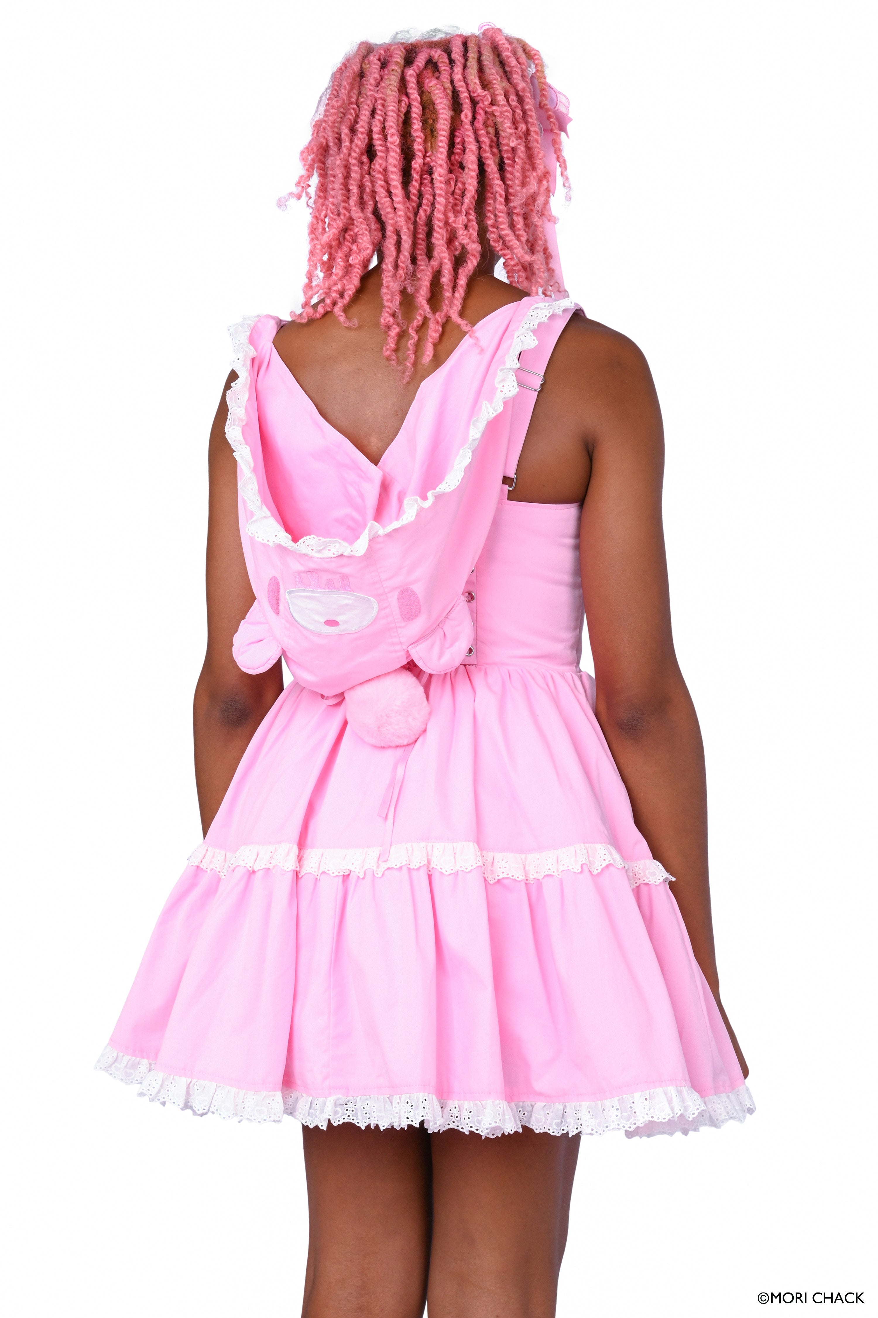 The dress's oversized hood features Gloomy's face appliqué on the front, and is fully removable with a pair of buttons. Its straps are fully adjustable and are accented with a claw detail at the front. The back offers tons of stretch with the shirred corset lacing panel, and is complete with a fluffy removable pom-pom tail!