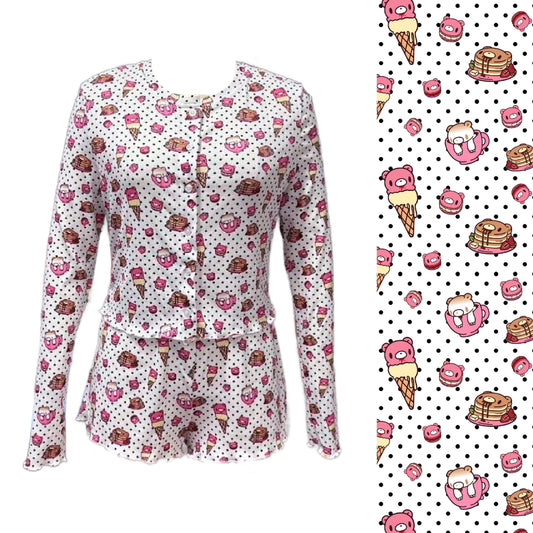 Vibrant pastel all-over print featuring bears, hearts, and rainbows